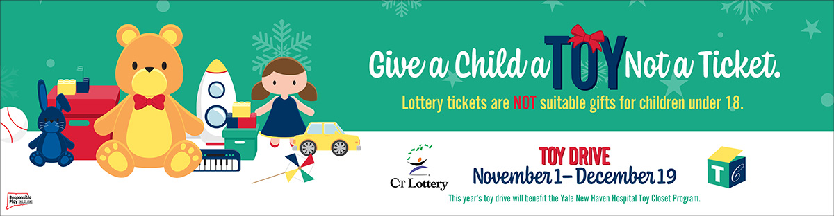 The CT Lottery reminds you that lottery tickets are not suitable gifts for children under 18. Give them a toy instead! This year, we’re collecting toys for the Yale New Haven Hospital Toy Closet Program to help provide every pediatric patient an age-appropriate toy or small gift.